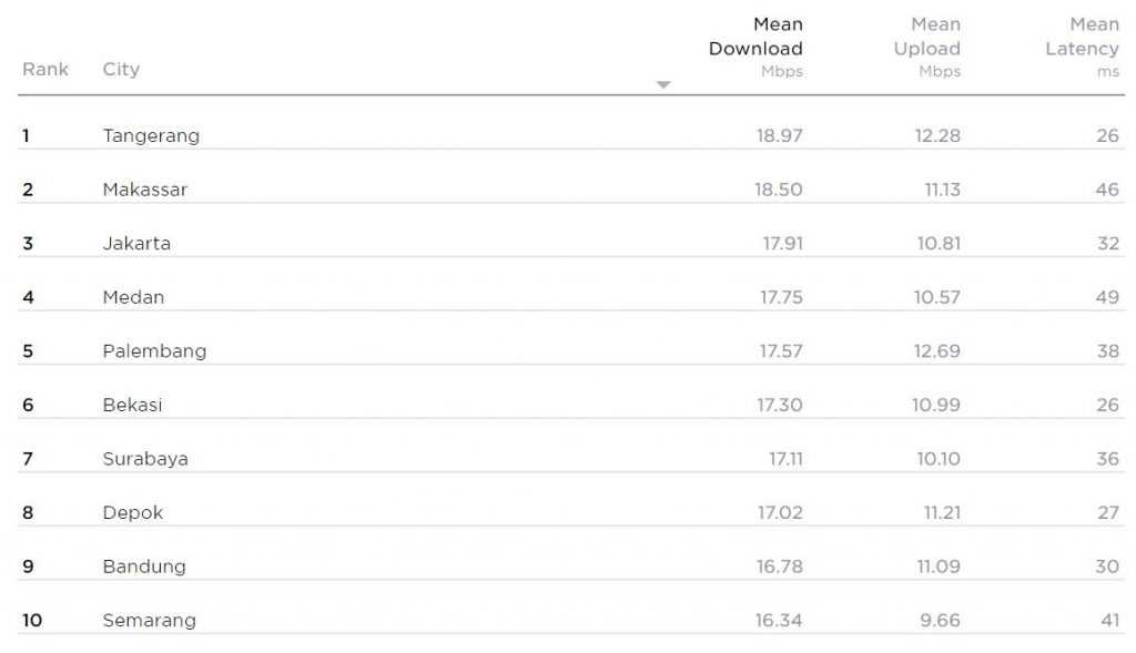 Sedangkan Jakarta berada di tempat ketiga dengan kecepatan internet 17,91 Mbps untuk urusan download. Sedangkan upload-nya tembus 10,81 Mbps dan latensinya 32 ms.
