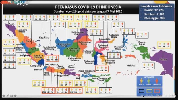 Muhadjir menunjukkan peta kasus Corona tanggal 7 Mei, di mana total ada 12.776 kasus positif, 2.381 orang sembuh, dan 930 orang meninggal dunia. Muhadjir mengatakan wilayah DKI Jakarta merupakan provinsi dengan kasus terbanyak.
