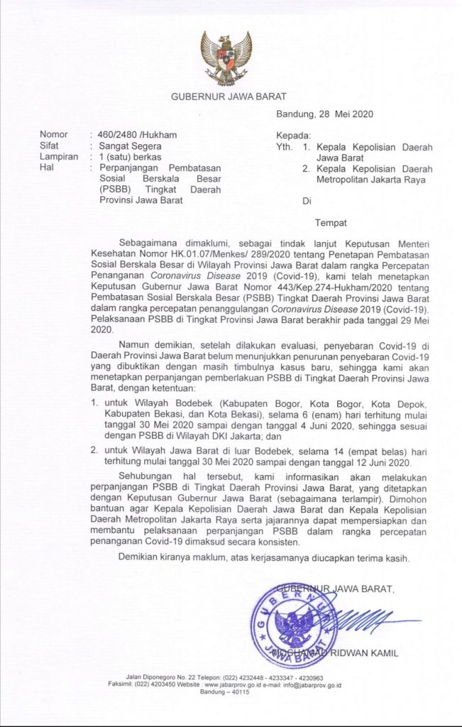 Dalam surat itu ada dua poin penting. Pertama, untuk wilayah Kabupaten/Kota Bogor, Kota Depok, Kabupaten/Kota Bekasi (Bodebek) PSBB akan diperpanjang selama enam hari, terhitung tanggal 30 Mei 2020 sampai dengan 4 Juni 2020. Sementara itu untuk wilayah Jabar di luar Bodebek, masa perpanjangan PSBB selama 14 hari terhitung 30 Mei 2020 sampai dengan 12 Juni 2020.