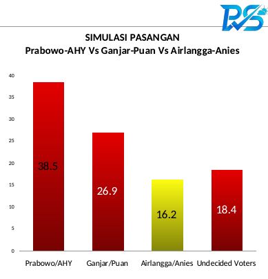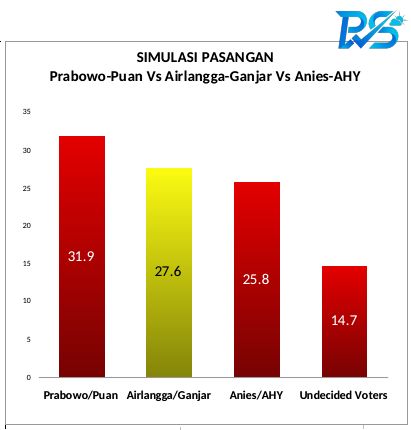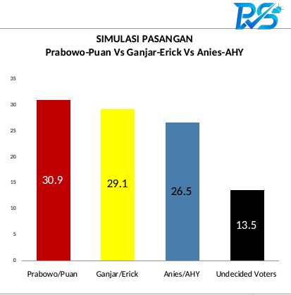 Pada simulasi Prabowo-Puan Maharani, pasangan ini unggul dengan suara responden 31,9%. Selanjutnya ada simulasi pasangan Airlangga Hartarto-Ganjar Pranowo dan Anies Baswedan-Agus Harimurti Yudhoyono (AHY).