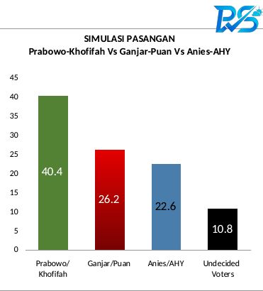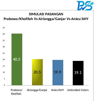 Pasangan Prabowo-Khofifah tetap unggul melawan kombinasi Airlangga-Ganjar dan Anies-AHY. Prabowo-Khofifah meraih 40,5% suara responden.